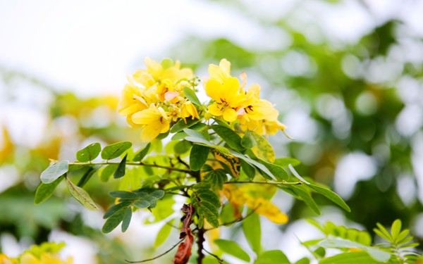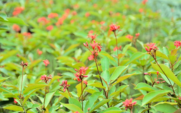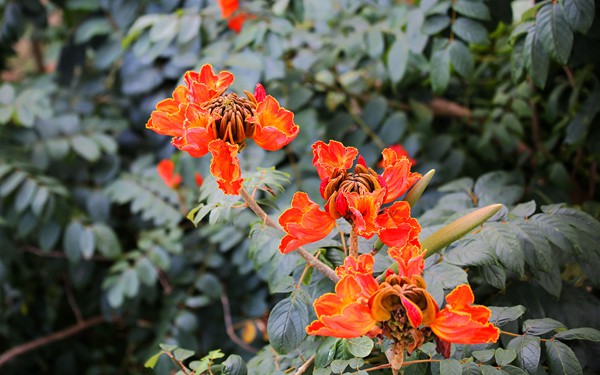 樹姿婆娑,羽葉茂盛,火燒花開于蒼翠的樹冠之上,極似一把把火炬,烈火般紅艷奪目。當(dāng)清風(fēng)的溫柔,遇上海南的熱情,碰撞出如童話般絢麗的極樂(lè)世界。有鳥兒們?cè)谥︻^跳躍著,它們?cè)诰G蔭中歡快歌唱。有花兒們?cè)诖渚G的枝葉中隨風(fēng)舞蹈,姹紫嫣紅,繽紛繚繞在校園之中,它們?cè)谫濏炦@滿園花色的美好。