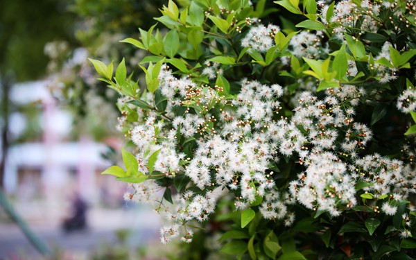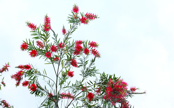 滿樹的紅千層掩映在眾綠之中,色彩鮮艷美麗,株形美觀,猩紅色的花朵綴滿一樹,層層疊疊,層次清晰,千百枝雄蕊組成一支支艷紅花束,雖不及大紅海棠的妖艷,卻有著它那獨(dú)特的風(fēng)韻,颯爽的風(fēng)姿。