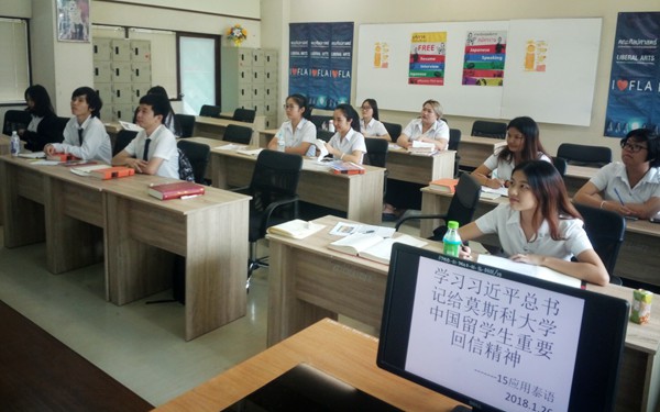 1月26日下午,我院在泰國拉嘎邦先皇科技學(xué)院留學(xué)的15級(jí)應(yīng)用泰語班同學(xué),召開了“學(xué)習(xí)習(xí)近平總書記給莫斯科大學(xué)中國留學(xué)生重要回信精神”主題班會(huì)。此次班會(huì)由班長楊坤鵬主持,全班14名同學(xué)參加了班會(huì)。