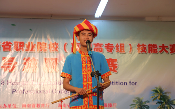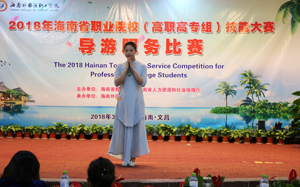 比賽分為中文組別和英文組別,包括有導(dǎo)游模擬、知識(shí)筆試以及才藝展示等競(jìng)賽環(huán)節(jié)。在比賽中,選手們?nèi)σ愿?、從容發(fā)揮,盡情展現(xiàn)了自我專業(yè)素養(yǎng)和能力,也為現(xiàn)場(chǎng)觀眾們帶來了一系列精彩的歌舞、樂器、跆拳道等表演,其中以富有民族特色的中國(guó)功夫和瓊劇表演深得評(píng)委老師的贊揚(yáng)。