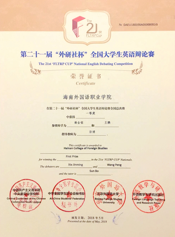5月21日,由團(tuán)中央、全國學(xué)聯(lián)秘書處、北京外國語大學(xué)主辦,外語教學(xué)與研究出版社承辦的第21屆“外研社杯”全國大學(xué)生英語辯論賽全國總決賽在北京外國語大學(xué)落幕,從華東、華西、華南、華北四大賽區(qū)500所院校中勝出的112支大學(xué)代表隊(duì)同臺(tái)競技,進(jìn)行了為期六天的激烈角逐。由英語系謝金銘、王鵬兩位同學(xué)組成的我院代表隊(duì)表現(xiàn)優(yōu)異、脫穎而出,斬獲全國總決賽一等獎(jiǎng),開創(chuàng)了我省高校參賽歷史的最好成績,同時(shí)也是全國高職院校參賽史上的最好成績。