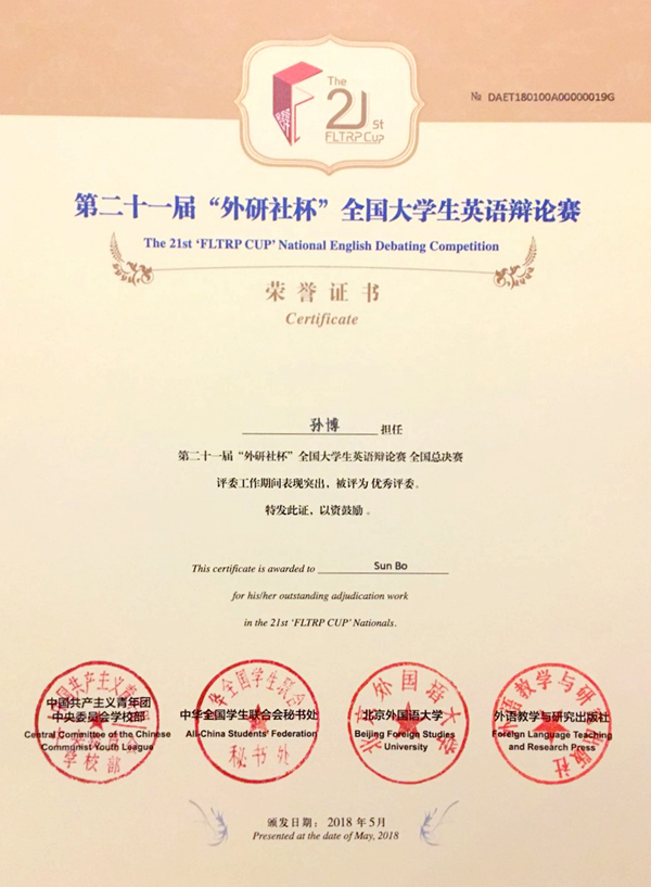 “外研社杯”全國大學(xué)生英語辯論賽創(chuàng)辦于1997年,是國內(nèi)創(chuàng)辦最早、規(guī)模最大的全國性英語辯論賽事,也是目前全球英語辯論界公認(rèn)的最高競技形式。歷經(jīng)二十一年積淀和不懈努力,“外研社杯”英語辯論賽的權(quán)威性和影響力已被全國廣大英語教師及在校學(xué)生所認(rèn)可,在高校中享有盛譽(yù)。在學(xué)院領(lǐng)導(dǎo)的重視支持和教師團(tuán)隊(duì)的配合指導(dǎo)下,我院學(xué)子在全國外語類競賽中頻頻獲獎(jiǎng),既很好地宣傳了我院外語教學(xué)的水平,又有力提升了學(xué)生的外語競爭力,為我院乃至全省國際化辦學(xué)營造了良好的外語學(xué)習(xí)氛圍。