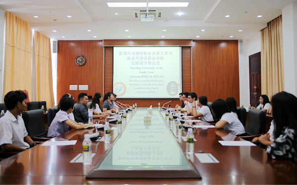 開(kāi)營(yíng)儀式首先播放了兩校宣傳短片,并由國(guó)際交流中心主要負(fù)責(zé)人黃子艿為與會(huì)人員介紹學(xué)院辦學(xué)情況以及此次交流團(tuán)開(kāi)展的情況。兩位泰語(yǔ)留學(xué)生馮蘭芬、Tommy分別發(fā)言,分享了自己在我院的留學(xué)經(jīng)歷。BSRU領(lǐng)隊(duì)老師和學(xué)生代表一一發(fā)言,表達(dá)了對(duì)即將開(kāi)始的學(xué)習(xí)生活的期待。