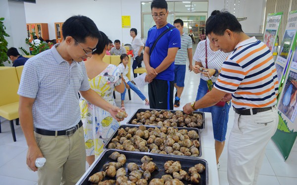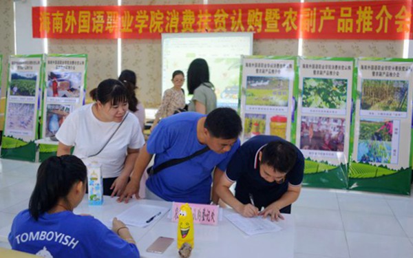 “我要十斤黑豬肉”“我要十斤香芋”……10月16日上午11時(shí)許,我院食堂二樓教職工用餐大廳內(nèi)人聲鼎沸,大家圍著一張擺放“農(nóng)副產(chǎn)品認(rèn)購(gòu)登記處”牌子的桌子前你一句我一句對(duì)著正在低頭寫字的人員說著,直至看到寫字的人在一張表格上勾勾寫寫并寫上自己的名字后才放心地離開。不遠(yuǎn)處,三張餐桌搭建起來的長(zhǎng)形臺(tái)面上,整齊擺放著五個(gè)餐盤,里面摞滿了大大小小的芋頭,吸引著來往之人駐足品嘗。臺(tái)面兩側(cè),立著六張印著各種農(nóng)副產(chǎn)品的照片和文字介紹的宣傳畫,一條寫著“海南外國(guó)語職業(yè)學(xué)院消費(fèi)扶貧認(rèn)購(gòu)暨農(nóng)副產(chǎn)品推介會(huì)”的紅色橫幅掛在上空,顯目地告訴這里正在發(fā)生的事情。