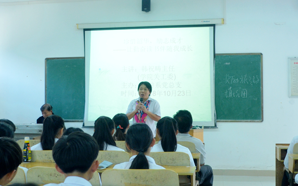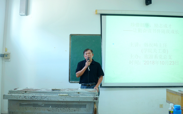 10月23日下午,我院旅游系在多媒體13教室舉辦題為“珍惜紹華 勵志成才——讓勤奮讀書伴隨我成長”的專題講座,邀請我院關工委主任韓祝疇為該系2018級五年一貫制新生分享“讀書與成長”的知識。該系黨總支主要負責人林明霞主持講座。
