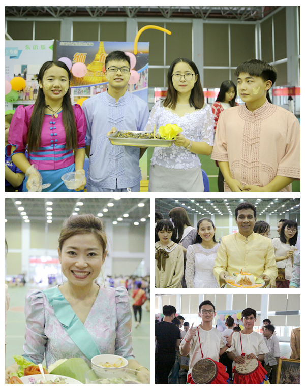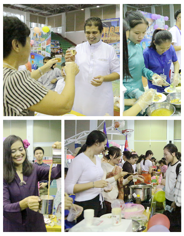 一進(jìn)入體育館大家就可以看到由課桌拼成的臨時操作臺處,到處有東語系同學(xué)們忙碌的身影,一時間,鍋碗瓢盆聲,叫好聲響成一片。各種美食琳瑯滿目,香噴噴的越南米飯、散發(fā)醇香的馬來西亞拉茶、緬甸的特色涼拌面、酸辣口味的韓國炒年糕……同學(xué)們由外教指導(dǎo)合作出來的精心準(zhǔn)備著各種美食,興高采烈地向同學(xué)們展示自己的勞動成果。馬拉西亞的外教老師現(xiàn)場就給同學(xué)們表演了馬拉西亞拉茶的制作過程,兩位柬埔寨留學(xué)生為大家表演本國樂器,一時間吸引很多師生駐足觀看,好不熱鬧。前來參加的師生都紛紛師生紛紛拿出手機(jī)、相機(jī)拍照,并第一時間利用微信、微博等新媒體發(fā)到朋友圈,曬美食樂事,表達(dá)愉悅的心情,一時間大家紛紛為同學(xué)們的精湛的廚藝點贊。