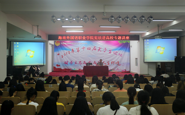 12月4日,正值第五個(gè)國(guó)家憲法日之際,我院邀請(qǐng)中國(guó)行為法學(xué)會(huì)金融法律研究會(huì)副會(huì)長(zhǎng)兼秘書(shū)長(zhǎng)、海南省法學(xué)會(huì)金融法治研究會(huì)會(huì)長(zhǎng)、我院兼職法制副校長(zhǎng)劉建來(lái)校,為廣大同學(xué)做憲法精神解讀。我院學(xué)生處負(fù)責(zé)人主持講座,近500名師生聆聽(tīng)了講座。
