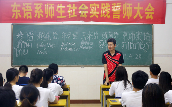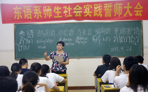 根據(jù)今年省教育廳4月18日下達的文件,本著“職業(yè)教育活動周”設(shè)立的內(nèi)容,批準(zhǔn)我院泰語、柬埔寨語、馬來語、印尼語、越南語、緬甸語六個專業(yè)的學(xué)生外出學(xué)習(xí)、開展社會實踐。為確保此次活動收到實效,我院東語系于4月28日晚在二號教學(xué)樓501教室舉行“職業(yè)教育活動周”學(xué)生社會實踐動員誓師大會。東語系黨總支主要負責(zé)人王詒奎、主任郭艷萍教授出席,相關(guān)帶隊老師及學(xué)生共60余人參加。