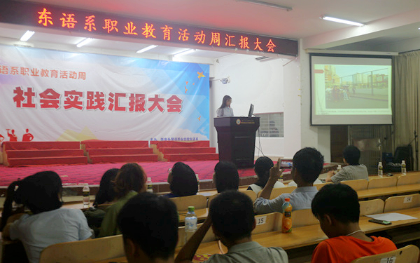 5月6日至12日,在我院開展的職業(yè)教育活動周中,東語系組織泰語、越南語、馬來語、印尼語、柬埔寨語、緬甸語六個小語種專業(yè)40多名學(xué)生代表在學(xué)院及系部的大力支持、精心部署下,由負(fù)責(zé)老師帶隊走出學(xué)院,前往廣西民族大學(xué)、云南民族大學(xué)、云南大理大學(xué)、天津外國語大學(xué)等國內(nèi)一流大學(xué)進行為期一周的課堂體驗學(xué)習(xí)。5月16日晚,東語系在圖書館多功能報告廳舉行職業(yè)教育活動周社會實踐匯報大會,由六個小語種專業(yè)學(xué)生代表匯報外出學(xué)習(xí)中的體驗及收獲。東語系黨總支主要負(fù)責(zé)人王詒奎、主任郭艷萍教授以及全體師生參加此次大會。