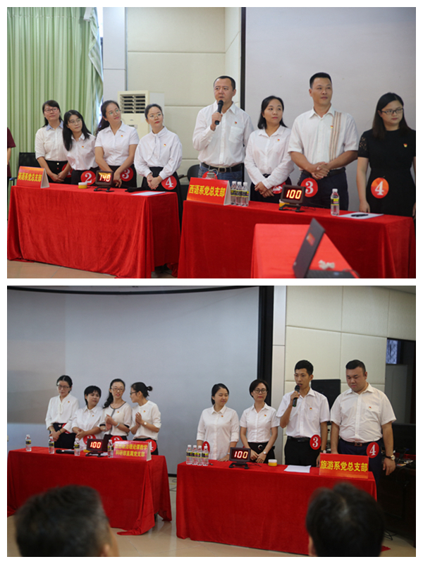 決賽設(shè)置了必答題、搶答題和觀眾互動(dòng)等環(huán)節(jié),題型為選擇題、判斷題和簡答題。比賽中,選手們精神飽滿、全神貫注、沉著應(yīng)賽。必答題穩(wěn)扎穩(wěn)打,搶答題毫秒必爭,觀眾互動(dòng)積極踴躍?,F(xiàn)場氣氛緊張熱烈,不時(shí)響起陣陣掌聲和加油吶喊聲。經(jīng)過激烈角逐,最終西語系黨總支部獲得競賽一等獎(jiǎng),旅游系黨總支部獲得二等獎(jiǎng),英語系黨總支部和思想政治理論課教學(xué)科研部直屬黨支部獲得三等獎(jiǎng)。