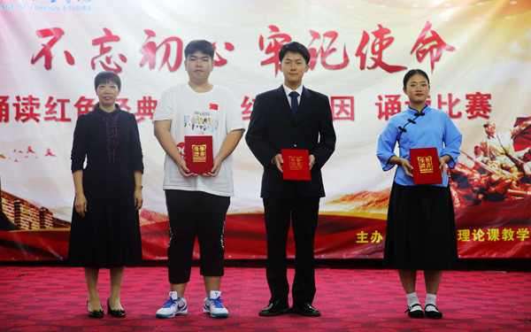 經(jīng)過(guò)評(píng)委組認(rèn)真評(píng)選,比賽共評(píng)為3個(gè)一等獎(jiǎng),分別是:19涉外事務(wù)3班蔡秋婷同學(xué)小組的《少年中國(guó)說(shuō)》、19英教5班,19旅管2班陳婆欣同學(xué)小組的《等待》、19語(yǔ)教2班謝東來(lái)同學(xué)小組的《少年中國(guó)說(shuō)》;5個(gè)二等獎(jiǎng),分別是:19英教6班李先英同學(xué)小組的《感恩的心,感謝有你》、19語(yǔ)教3班陳敏同學(xué)小組的《中華頌》、19酒管2班劉美容同學(xué)小組的《白雪樵留書》、19語(yǔ)教1班王護(hù)蓉同學(xué)小組的《我驕傲、我是中國(guó)人》、19英教3班4班5班陳雅慧婷同學(xué)小組的《盛世中國(guó)》;7個(gè)三等獎(jiǎng),分別是:19外貿(mào)一班陳露同學(xué)小組的《透過(guò)歷史的眼眸》、19旅管6班張玉茹同學(xué)小組的《讀中國(guó)》、19旅管5班陳漢天同學(xué)小組的《仰望長(zhǎng)征》、19翻譯1班符紅藝同學(xué)小組的《我的祖國(guó)》、19酒管3班王潤(rùn)澤同學(xué)小組的《中國(guó)夢(mèng).愛國(guó)情》、19英教3班楊曉彤同學(xué)小組的《我的祖國(guó)》、19英教7班尹弘敏同學(xué)小組的《紅巖》;此外,還評(píng)了10個(gè)優(yōu)秀獎(jiǎng)。