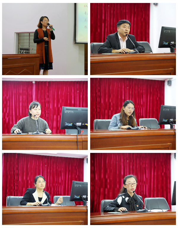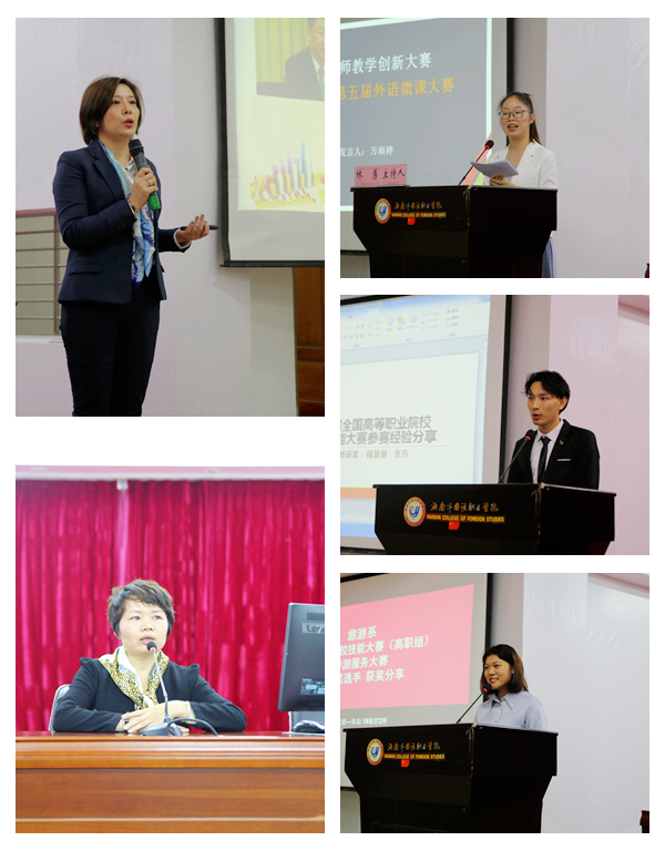 交流會(huì)上,六位教師及兩位學(xué)生分別代表微課團(tuán)隊(duì)、英語(yǔ)口語(yǔ)團(tuán)隊(duì)、旅游酒店技能大賽團(tuán)隊(duì)、日語(yǔ)技能大賽團(tuán)隊(duì)、俄語(yǔ)技能大賽團(tuán)隊(duì)、教學(xué)能力比賽團(tuán)隊(duì)分別進(jìn)行了競(jìng)賽經(jīng)驗(yàn)交流展示。隨后,英語(yǔ)系英語(yǔ)教育教研室鄭一新老師、國(guó)際商務(wù)系國(guó)際貿(mào)易教研室夏冰老師和毛澤東思想和中國(guó)特色社會(huì)主義理論體系概論教研室趙佳鈺老師分別代表2018-2019學(xué)年度優(yōu)秀教研室進(jìn)行從教學(xué)組織管理、專業(yè)建設(shè)、課程建設(shè)、師資隊(duì)伍建設(shè)、教學(xué)研究、科研項(xiàng)目等方面進(jìn)行工作經(jīng)驗(yàn)交流。