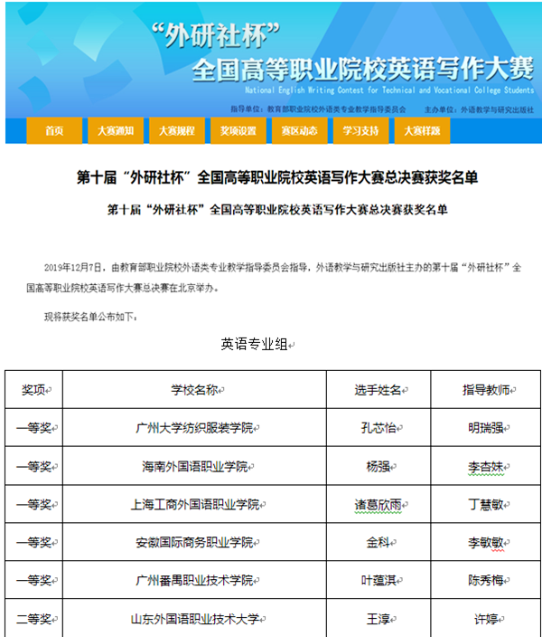 一直以來(lái),學(xué)院高度重視對(duì)學(xué)生英語(yǔ)寫作能力的培養(yǎng)和外語(yǔ)教學(xué)的改革手段。在“外研社杯”全國(guó)高等職業(yè)院校英語(yǔ)寫作比賽中,參賽成績(jī)不斷取得突破,這充分展示了我院外語(yǔ)辦學(xué)實(shí)力和人才培養(yǎng)質(zhì)量,也充分展示了我省高職英語(yǔ)教育教學(xué)改革的成果。