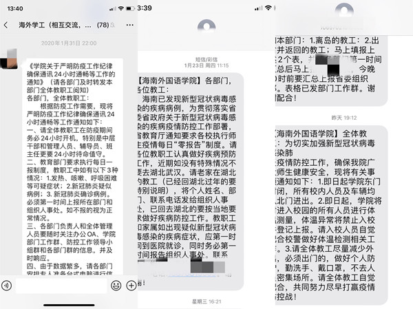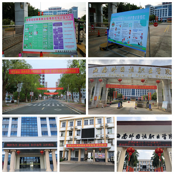 連日來,學院黨委書記曾鋒、院長李渝鳳等學院領導多次主持召開專題會議,研判校園疫情防控形勢,查找解決疫情防控突出問題,研究部署各項疫情防控工作,在第一時間成立了以黨委書記、院長為組長的新型冠狀病毒感染的肺炎疫情防控工作領導小組,制定《海南外國語職業(yè)學院防控新型冠狀病毒感染的肺炎疫情工作方案》,嚴格落實防控工作責任,明確具體防控措施,全面開展聯(lián)防聯(lián)控工作;并制定發(fā)布一系列通知、倡議,凝聚全院師生力量,全力做好疫情防控工作,堅決防止疫情在校園擴散蔓延。