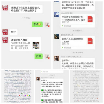 得知消息后,各語(yǔ)種專業(yè)教師紛紛掃碼添加,但是由于全國(guó)申請(qǐng)加入的志愿者人數(shù)過(guò)多,系統(tǒng)一直顯示“添加次數(shù)過(guò)多,不能添加”。為了能夠盡快加入進(jìn)去,為抗擊疫情工作多做貢獻(xiàn),各系部負(fù)責(zé)人主動(dòng)與中國(guó)防疫翻譯志愿者小組負(fù)責(zé)人聯(lián)系溝通,最終各語(yǔ)種教師得以加入,并根據(jù)不同語(yǔ)種分配到不同的工作群中,由此開啟了老師們不一樣的“宅家”生活。