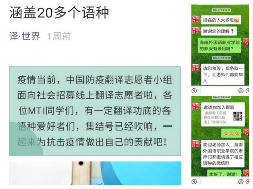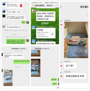 “能幫忙翻譯下上面的文件嗎”“幫忙看下口罩企業(yè)、資質(zhì)”“各位老師麻煩翻譯一下”……中國(guó)防疫翻譯群里,這樣的消息不斷出現(xiàn)?!笆謾C(jī)每天都響個(gè)不停。一聽到響,身體就已經(jīng)是條件反射般馬上拿起來(lái)看,生怕錯(cuò)過(guò)任何一個(gè)翻譯任務(wù)。即使只是一句話或一個(gè)名稱的翻譯,也希望能夠出自己的一份力?!痹侥险Z(yǔ)專業(yè)教師朱斯說(shuō)道。身為黨員的她就在多個(gè)防疫翻譯群里開展志愿服務(wù)。