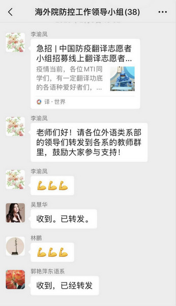 2月3日,李渝鳳院長(zhǎng)在學(xué)院防控工作領(lǐng)導(dǎo)小組微信群中發(fā)布了一則中國(guó)防疫翻譯志愿者小組招募線上翻譯志愿者的消息,并鼓勵(lì)我院各個(gè)語(yǔ)種專業(yè)教師參加支持。隨即,英語(yǔ)系、國(guó)際商務(wù)系、東語(yǔ)系、西語(yǔ)系、旅游系等系部負(fù)責(zé)人紛紛在本部門微信群中廣而告之,鼓勵(lì)老師們積極參加。