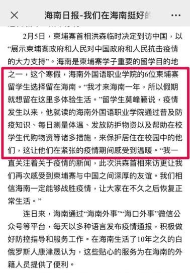 在現(xiàn)有工作基礎(chǔ)上,我院創(chuàng)新性開展針對(duì)外籍師生疫情防控工作的宣傳,積極引導(dǎo)外籍師生全面客觀認(rèn)識(shí)國(guó)家和海南的疫情防控,支持和鼓勵(lì)外籍師生講好疫情防控的故事。