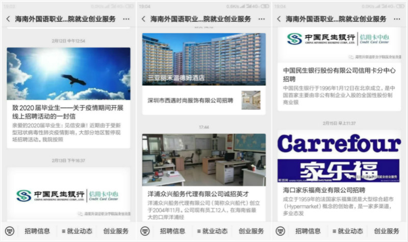 “為了不耽誤學(xué)生就業(yè),我們現(xiàn)在基本上都是用網(wǎng)絡(luò)和電話中辦公,向?qū)W生發(fā)布招聘信息,為學(xué)生開展就業(yè)指導(dǎo)和服務(wù)?!蔽以簩?shí)訓(xùn)就業(yè)處工作人員說,疫情發(fā)生后,他們基本上都采取微信、QQ、電話、郵箱等線上平臺,為畢業(yè)生與用人單位提供咨詢、手續(xù)辦理等方面的服務(wù)和幫助。目前,我院不斷加強(qiáng)與省就業(yè)局及天涯人力資源管理公司等聯(lián)系,進(jìn)一步發(fā)揮校友資源,加大力度開辟企業(yè)網(wǎng)上招聘渠道,搭建畢業(yè)生與用人單位“云雙選”橋梁,努力為畢業(yè)生提供更多的就業(yè)門路。