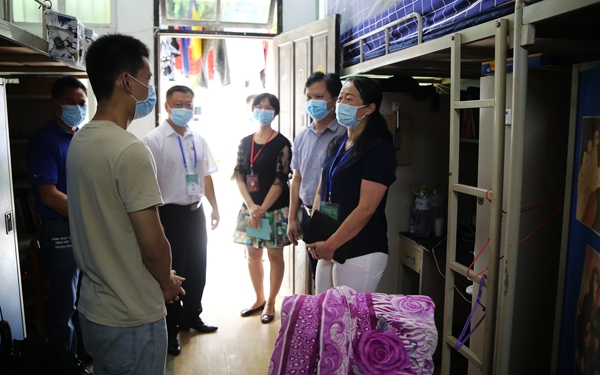 當(dāng)天,學(xué)院各系部紛紛開展開學(xué)“復(fù)學(xué)第一課”。邢彩虹副市長一行走進(jìn)綜合樓教學(xué)區(qū),查看課堂教學(xué)情況,對學(xué)院在每間教室配備防疫物資包的做法予以肯定。在學(xué)生宿舍區(qū),她隨機(jī)走進(jìn)一間宿舍,與一名剛回到學(xué)校的學(xué)生親切交談。在食堂,看到門口、地面、餐桌等地均設(shè)置了防護(hù)設(shè)備、物資和標(biāo)記,邢彩虹副市長表示贊許,尤其是肯定了學(xué)院在食堂門口洗手臺(tái)配置了自動(dòng)感應(yīng)水龍頭、洗手液、洗潔精等的做法,指出學(xué)院工作有創(chuàng)新且非常人性化。在校醫(yī)室和臨時(shí)留觀室,她實(shí)地了解防控物資儲(chǔ)備、突發(fā)事件應(yīng)急處置等情況。