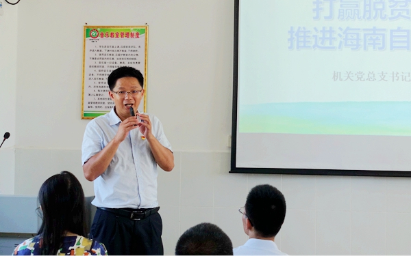 參加完采摘節(jié)活動,機關(guān)黨總支書記邢益承隨即在祖坡小學為黨員們上了一堂主題為“打贏脫貧攻堅戰(zhàn),推進海南自貿(mào)港建設(shè)”的黨課。黨課中,他從“脫貧攻堅進展符合預期”、“扶貧脫貧的中國方案”、“不獲全勝決不收兵”、“扶貧助力海南自貿(mào)港建設(shè)”四個方面向大家介紹了開展脫貧攻堅工作的重要意義、主要內(nèi)容、取得的成就、待解決的問題,以及在海南自貿(mào)港建設(shè)中如何更好地開展扶貧工作等內(nèi)容。他指出,打贏脫貧攻堅是海南自貿(mào)港建設(shè)的底線目標、基本前提和重要內(nèi)容。在加快建設(shè)海南自貿(mào)港進程中,大家決不能有“喘口氣、歇歇腳”的念頭,要繼續(xù)強化作風建設(shè),反復壓實責任,進一步增強緊迫感,持之以恒推進各項工作,確保脫貧攻堅工作措施一項項落實到位。