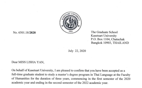 7月22日,我院再傳喜訊,東語系應(yīng)用泰語專業(yè)2016級(jí)嚴(yán)麗莎同學(xué)收到泰國農(nóng)業(yè)大學(xué)錄取通知書,考上了該大學(xué)泰語專業(yè)碩士研究生。