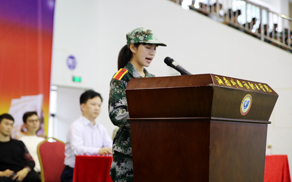 來自人文藝術系2020級語文教育1班的新生代表謝卓琪同學上臺發(fā)言,對承訓單位的領導、學院領導以及教官們致以崇高的敬意和感謝。她表示這次軍訓培養(yǎng)了我們的愛國主義和集體主義精神,強化了我們的國防意識,磨練了我們堅強的意志,鑄造了我們艱苦奮斗的精神。她呼吁各位同學繼續(xù)發(fā)揚一不怕苦二不怕累的精神,嚴格遵守學院的各項規(guī)章制度,努力學習專業(yè)知識和職業(yè)技能,不斷提高我們的綜合素質,為建設更加強大的祖國、為學院的騰飛發(fā)展、為實現(xiàn)我們的大學夢想繼續(xù)努力。