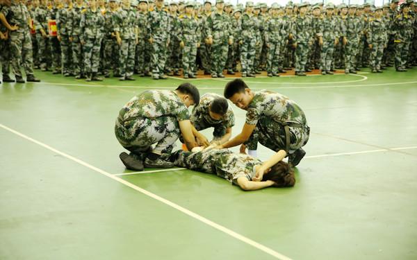 各連隊列隊完畢后,分列式表演正式開始。30個連隊以飽滿的精神狀態(tài)接受檢閱,受閱方隊在教官的指揮下依次通過主席臺。他們斗志昂揚、口號響亮、隊列整齊,展現(xiàn)了2020級新生的風采。緊接著部分優(yōu)秀軍訓學員進行了軍事技能匯報表演,如軍體拳和戰(zhàn)場救護演練,一系列的精彩的表演贏得了現(xiàn)場觀眾的陣陣掌聲。