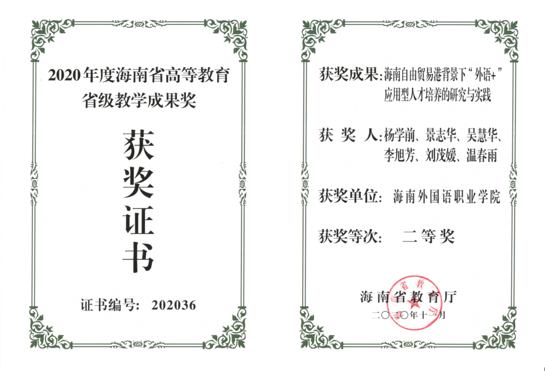 日前,海南省教育廳公布了2020年海南省高等教育省級教學(xué)成果獲獎名單,由我院副院長楊學(xué)前教授、教指委副主任景志華教授、教務(wù)處負(fù)責(zé)人吳慧華、旅游系負(fù)責(zé)人李旭芳、西語系副主任劉茂媛教授、國際商務(wù)系副主任溫春雨完成的教學(xué)成果“海南自由貿(mào)易港背景下‘外語+’應(yīng)用型人才培養(yǎng)的研究與實踐”喜獲二等獎。