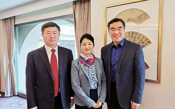院長(zhǎng)李渝鳳教授與北京外國(guó)語(yǔ)大學(xué)原副校長(zhǎng)、中國(guó)職業(yè)外語(yǔ)教育發(fā)展研究中心執(zhí)行委員會(huì)主任閆國(guó)華和教育部職業(yè)院校外語(yǔ)類(lèi)專業(yè)教學(xué)指導(dǎo)委員會(huì)主任委員、山東外貿(mào)職業(yè)學(xué)院院長(zhǎng)刁建東合影