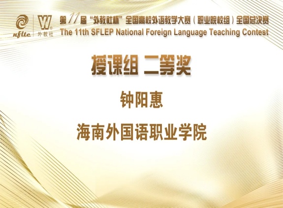 4月8日至9日,第十一屆“外教社杯”全國高校外語教學大賽(職業(yè)院校組)全國總決賽隆重舉辦,我院選手鐘陽惠老師代表海南省參加總決賽。鐘陽惠老師以扎實的語言功底、從容的教態(tài)、清晰的教學思路、靈活多樣的教學方法、課程思政元素的有效融合等“征服”了大賽評委,最終獲得授課組的二等獎。