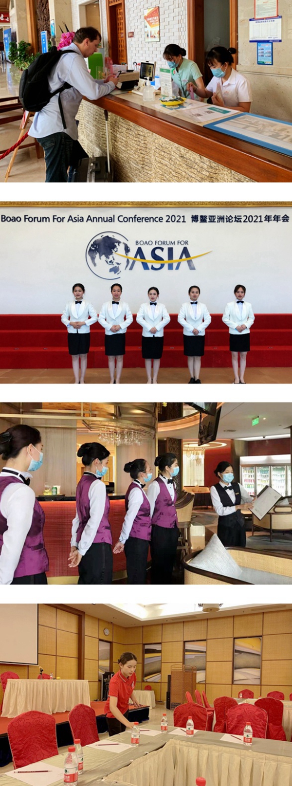 4月18日至21日,博鰲亞洲論壇2021年年會在海南博鰲舉行。本次年會以“世界大變局:共襄全球治理盛舉 合奏‘一帶一路’強音”為主題,來自60多個國家和地區(qū)的2600多名代表參會,凝心聚智,為推動亞洲和世界共同發(fā)展貢獻“博鰲方案”。作為連續(xù)多年服務(wù)博鰲亞洲論壇年會的高校,我院今年從各系部中共選派105名優(yōu)秀學生參與年會志愿服務(wù)工作,在會務(wù)服務(wù)、總機接待、前臺、禮賓、客房、中西餐廳、宴會服務(wù)等崗位上提供服務(wù),為保障年會的順利進行做出積極貢獻,得到組委會與中外與會嘉賓的廣泛贊許。