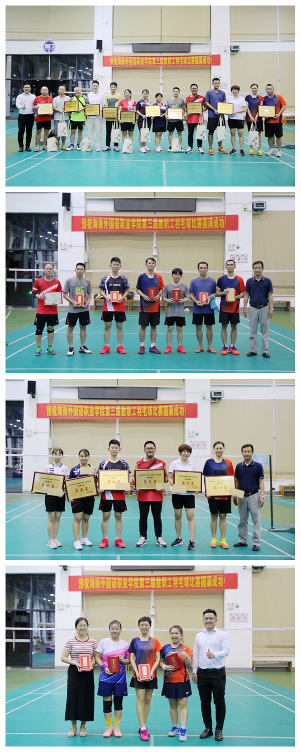 為活躍校園文化氛圍,豐富教職工業(yè)余文化生活,充分展現(xiàn)我院教職工風(fēng)采,增進(jìn)教職工交流與溝通,增強集體凝聚力,構(gòu)建健康、快樂、和諧校園,5月8日至13日,由學(xué)院工會組織在體藝館內(nèi)舉辦第三屆教職工羽毛球比賽正式開賽,來自學(xué)院機關(guān)各部門、各系部共10支參賽隊參加了團體的比賽,26名教職工參加了單項的比賽。13日下午,比賽在體藝館落下帷幕,經(jīng)過4天的激烈角逐,國際商務(wù)系代表隊摘獲團體比賽第一名,公共教學(xué)部代表隊、機關(guān)一代表隊分獲二、三名。