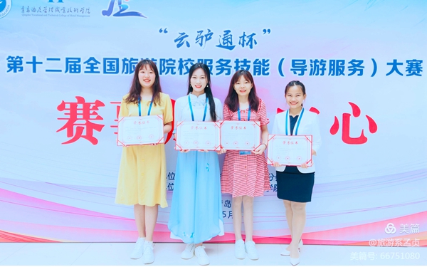 經(jīng)過四天的激烈角逐,我院參賽選手在1035名選手脫穎而出,吳淑斐、楊若冰獲得高等院校組普通話導游服務(wù)三等獎,黃金蘆、張雅婷獲得高等院校組英語導游服務(wù)三等獎。