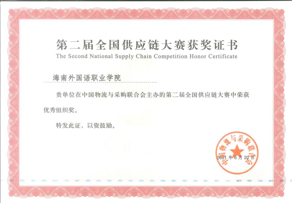 第二屆全國供應(yīng)鏈大賽“優(yōu)秀組織獎”獎狀