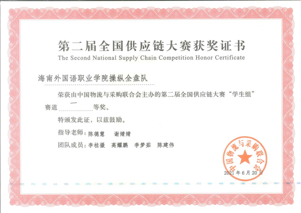 第二屆全國供應(yīng)鏈大賽總決賽全國一等獎獎狀