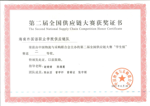 第二屆全國供應(yīng)鏈大賽總決賽全國二等獎獎狀
