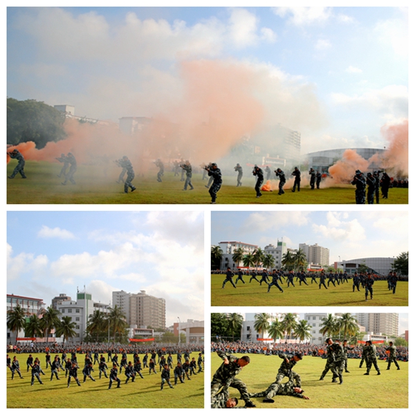 教官和新生帶來(lái)的軍體拳表演訓(xùn)練有素,血?dú)夥絼偅徽幸皇礁蓛衾?;匕首操方陣女生們英姿颯爽,手握刀柄,拳峰向上,動(dòng)作規(guī)范,整齊劃一,引來(lái)掌聲不斷。2021級(jí)新生們充分展示了“小萌新”們的“大力量”,展現(xiàn)了我院學(xué)子奮發(fā)向上的精神風(fēng)貌和青春風(fēng)采。