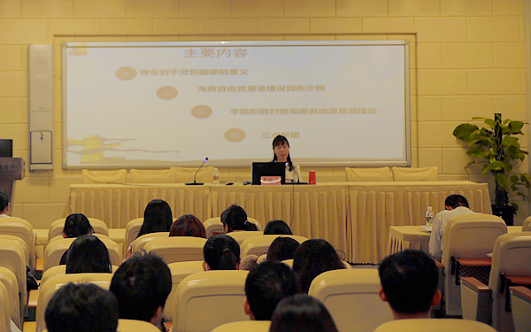 黃麗芹副書(shū)記結(jié)合習(xí)近平總書(shū)記在慶祝中國(guó)共產(chǎn)黨成立100周年大會(huì)上的重要講話精神以及黨和國(guó)家發(fā)展進(jìn)程,聯(lián)系實(shí)際,從青年對(duì)于黨和國(guó)家的意義、海南自由貿(mào)易港建設(shè)蹄疾步穩(wěn)、學(xué)院積極對(duì)接海南自由貿(mào)易港建設(shè)、三點(diǎn)希望等四個(gè)方面為我院學(xué)生的成長(zhǎng)成才指引方向。