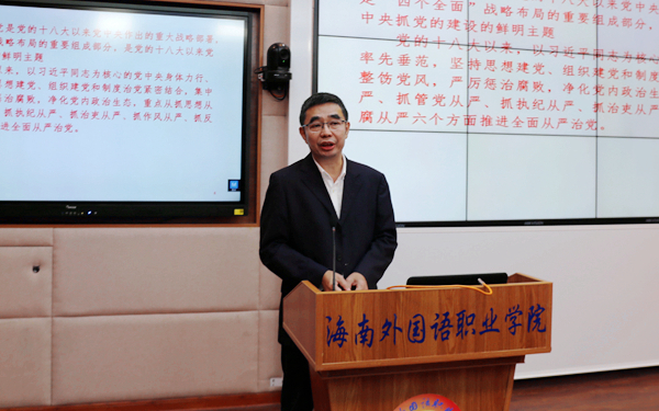為深入學(xué)習(xí)貫徹習(xí)近平新時(shí)代中國(guó)特色社會(huì)主義思想,特別是全面從嚴(yán)治黨戰(zhàn)略,10月26日下午,學(xué)院黨委委員、紀(jì)委書(shū)記、省監(jiān)委駐學(xué)院監(jiān)察專員黃培怡圍繞《深入貫徹全面從嚴(yán)治黨戰(zhàn)略方針,為蹄疾步穩(wěn)推進(jìn)海南自由貿(mào)易港建設(shè)做貢獻(xiàn)》這一主題,為大學(xué)生們上了一堂內(nèi)容深刻而有意義的形勢(shì)與政策課。
