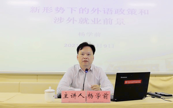 12月9日下午,學(xué)院黨委副書記、院長楊學(xué)前在綜合樓BE101為學(xué)生講授《新形勢下的外語政策和涉外就業(yè)前景》形勢與政策課。