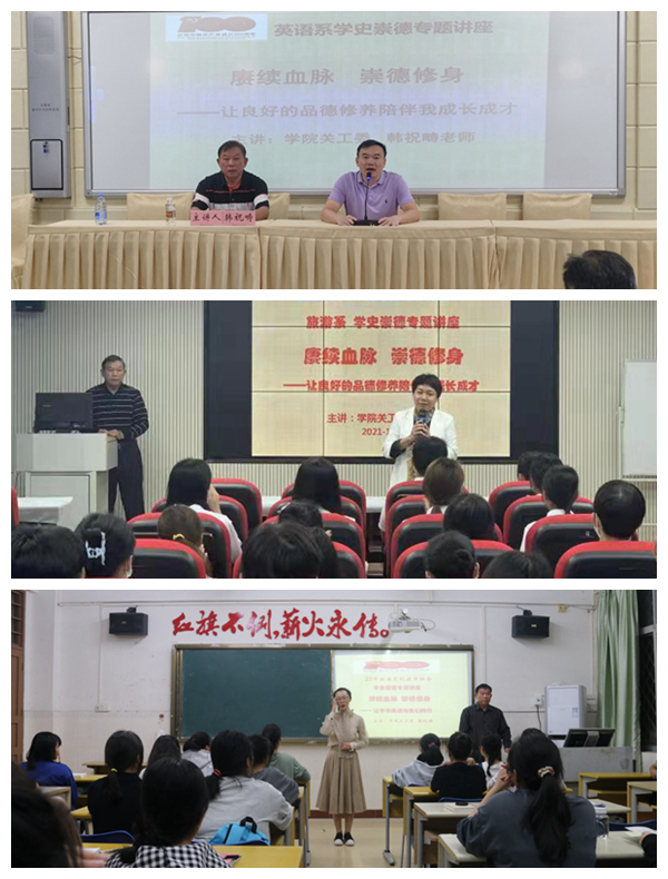 為深入推進(jìn)我院黨史學(xué)習(xí)教育,連日來,我院關(guān)工委主任韓祝疇先后為英語系、旅游系以及學(xué)院“二十三年紅旗不倒讀書協(xié)會(huì)”學(xué)生黨員、入黨積極分子和讀書協(xié)會(huì)會(huì)員作了三場(chǎng)《賡續(xù)血脈 崇德修身》專題講座。英語系黨總支副書記吳清暉、旅游系黨總支書記林明霞、“二十三年紅旗不倒讀書協(xié)會(huì)”指導(dǎo)老師趙佳鈺、關(guān)工委成員陳獻(xiàn)積老師等與學(xué)生一同聆聽講座。