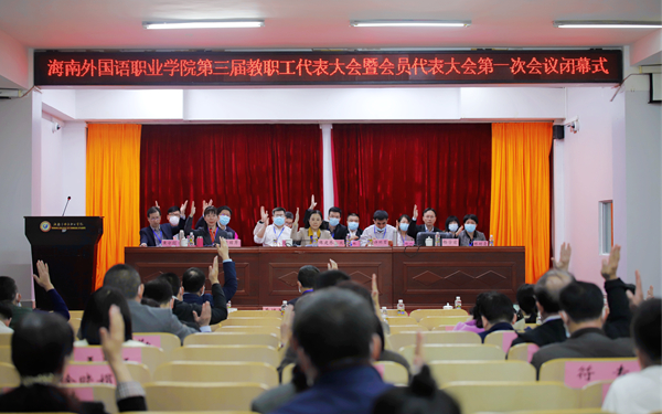 在雄壯的《國(guó)際歌》歌聲中,海南外國(guó)語(yǔ)職業(yè)學(xué)院第三屆教代會(huì)暨工代會(huì)第一次會(huì)議勝利閉幕。
