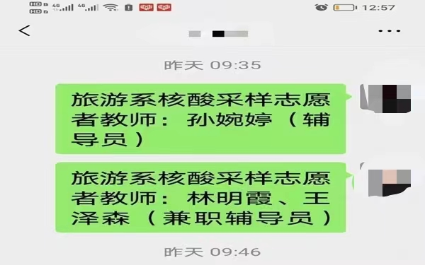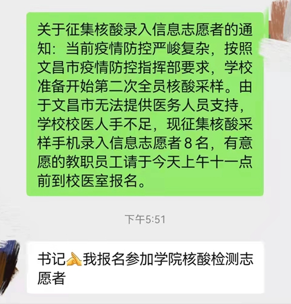為做好校園疫情防控工作,學院開展全員核酸檢測,但是面對數(shù)千位師生,學院的核酸采集能力明顯不足。學院黨委立即決定征集志愿者,一個征集通知發(fā)布在各個工作群中?!靶枰驹刚邌??我可以......”“我也可以......”