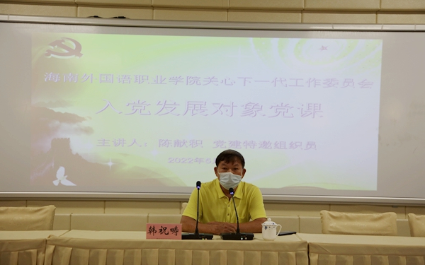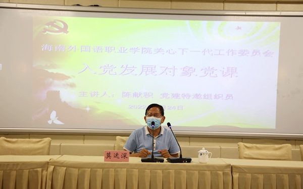 為進一步加強學院入黨發(fā)展對象的培養(yǎng)教育,強化政治理論學習,提升黨性修養(yǎng),5月24日,海南外國語職業(yè)學院發(fā)展對象專題黨課在BE101報告廳開課,特邀關工委黨建組織員陳獻積主講。關工委主任韓祝疇、關工委副主任莫運深出席專題黨課,莫運深主持此次黨課。