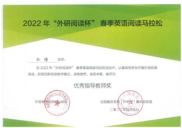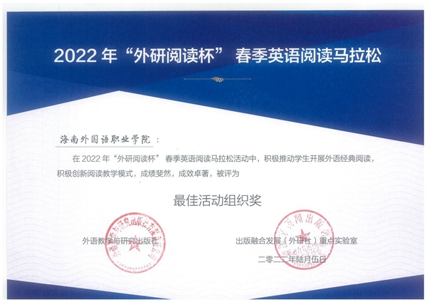 此外,組委會通過對活動參與院校學(xué)生的閱讀數(shù)據(jù)進(jìn)行統(tǒng)計,對學(xué)生有效閱讀量最多的3所院校/院系授予“最佳活動組織獎”,對班級閱讀量最高的6名任課教師授予“優(yōu)秀指導(dǎo)教師獎”。最終,我院榮獲“最佳活動組織獎”,涉外職業(yè)教育研究中心、英語系孫博老師榮獲“優(yōu)秀指導(dǎo)教師獎”。