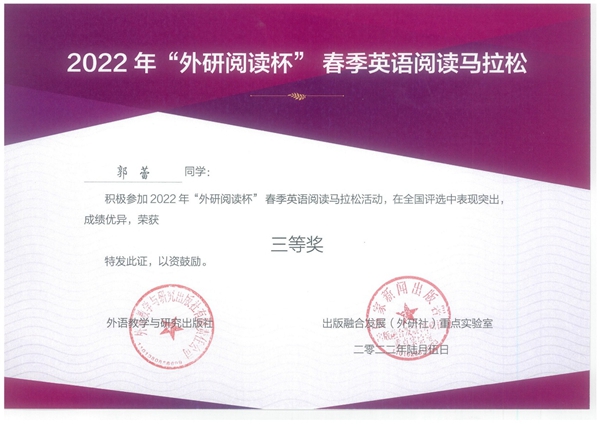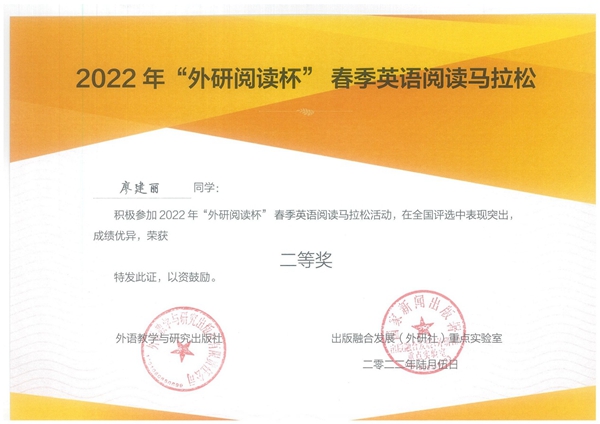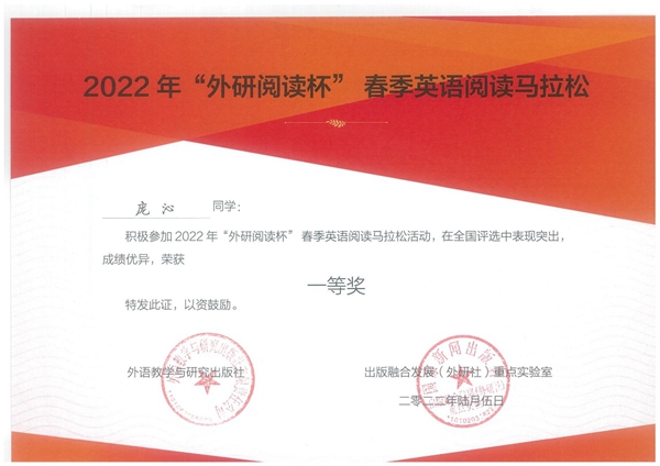 由外語教學(xué)與研究出版社聯(lián)合國家新聞出版署出版融合發(fā)展(外研社)重點實驗室大數(shù)據(jù)外語閱讀研究基地主辦,面向全國高職院校發(fā)起的2022年“外研閱讀杯”春季英語閱讀馬拉松活動圓滿結(jié)束。截至2022年5月22日,共有全國12個省、自治區(qū)和直轄市的17所高職院校提交校級評選獲獎作品203個參與全國評選。組委會對作品進(jìn)行統(tǒng)一評選,評選出全國一等獎2名、二等獎5名和三等獎8名。我院英語系20級英語教育5班龐沁同學(xué)基于英文名著《一個自己的房間》撰寫的英文書評“Woman, you are noble”在眾多參賽作品中脫穎而出,榮獲一等獎;21級應(yīng)用英語3班廖建麗基于英文名著《傲慢與偏見》撰寫的英文書評“How love and marriage should be”榮獲二等獎,20級應(yīng)用英語3班郭蕾同學(xué)基于英文名著《一個自己的房間》撰寫的“A Room of One's Own: Learn to be yourself”榮獲三等獎。