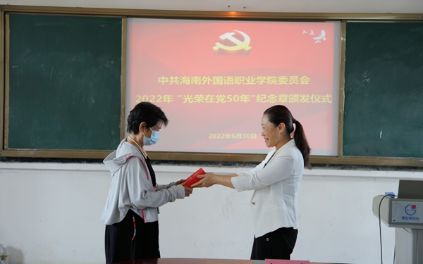 當(dāng)天上午舉行了“光榮在黨50年”紀(jì)念章頒發(fā)儀式,學(xué)院黨委書記佴建喬同志出席儀式并代表學(xué)院黨委向榮獲“光榮在黨50年”紀(jì)念章的老黨員頒發(fā)紀(jì)念章。她指出,“光榮在黨50年”紀(jì)念章蘊(yùn)含著作為一名共產(chǎn)黨員的“無限榮光”,希望老同志們珍惜榮譽(yù)、再接再厲,退休不褪色、離崗不離黨,弘揚(yáng)正能量、傳播好聲音,繼續(xù)為學(xué)院發(fā)展建言獻(xiàn)策、加油鼓勁。