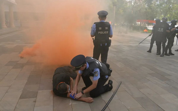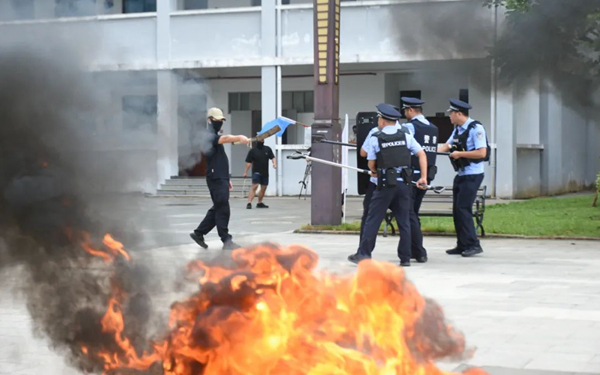 演練中,三名由工作人員扮演的嫌疑人持刀追砍過往行人,學(xué)校保安持械與之對(duì)峙并撥打110報(bào)警,市公安局指揮中心收到報(bào)告后,立即啟動(dòng)應(yīng)急預(yù)案,指令各相關(guān)單位前往現(xiàn)場(chǎng)處置。轄區(qū)派出所、附近巡邏警力、武警勤務(wù)警力及特警備勤警力先后趕到現(xiàn)場(chǎng),合力制服三名嫌疑人,并通知120對(duì)受傷人員進(jìn)行醫(yī)療救護(hù),交警對(duì)現(xiàn)場(chǎng)附近路面進(jìn)行管控,刑警對(duì)現(xiàn)場(chǎng)進(jìn)行全面勘察。