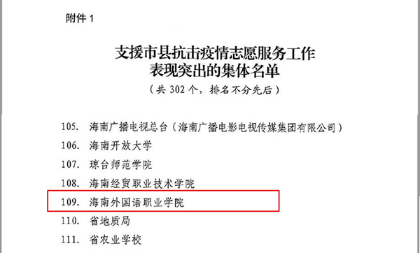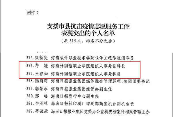 在此次通報表揚中,海南外國語職業(yè)學(xué)院被評為“支援市縣抗擊疫情志愿服務(wù)工作表現(xiàn)突出的集體”,符婕、王杏如、王文朋(時任文昌市教育局干部)被評為“支援市縣抗擊疫情志愿服務(wù)工作表現(xiàn)突出的個人”。